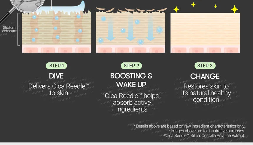 - Hecha con micro agujas como Cica Reedle™ compuestas por micro minerales derivados de partículas que ayudan a la absorción de ingredientes en la piel.
